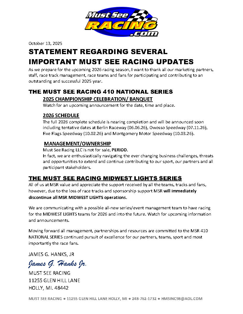 The series also announced that the 2025 Champions Awards Celebration will be held on January 10, 2026, at the Fairfield Inn in Grand Blanc, Michigan. Both the 410 National Series and Midwest Lights Series will be honored for their 2025 accomplishments.